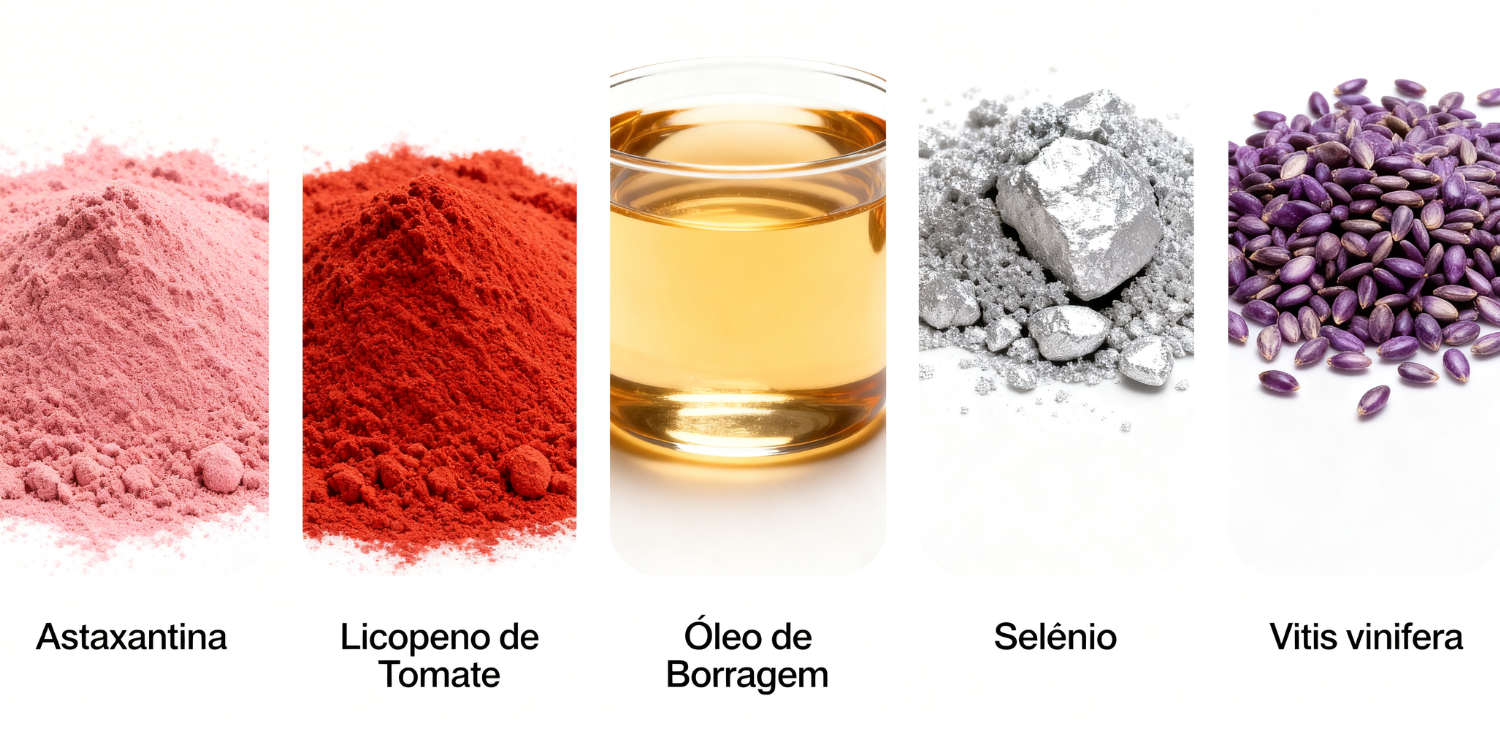 ● Vitis vinifera: Rico em antioxidantes, ajuda a reduzir o estresse oxidativo, melhora a circulação sanguínea e combate inflamações.
